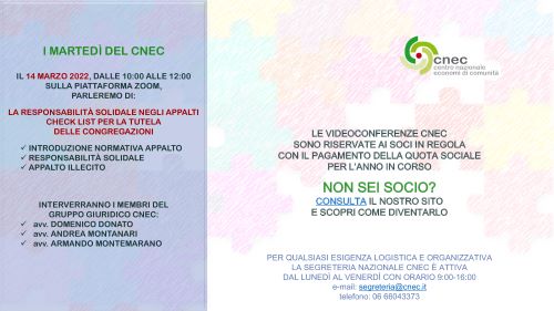 Martedì 14 marzo dalle ore 10 alle ore 12 si terrà l’incontro formativo in videoconferenza riservato agli Enti religiosi associati al CNEC (Consiglio Nazionale Economi di Comunità) che potranno iscriversi seguendo le indicazioni di cui al programma allegato.